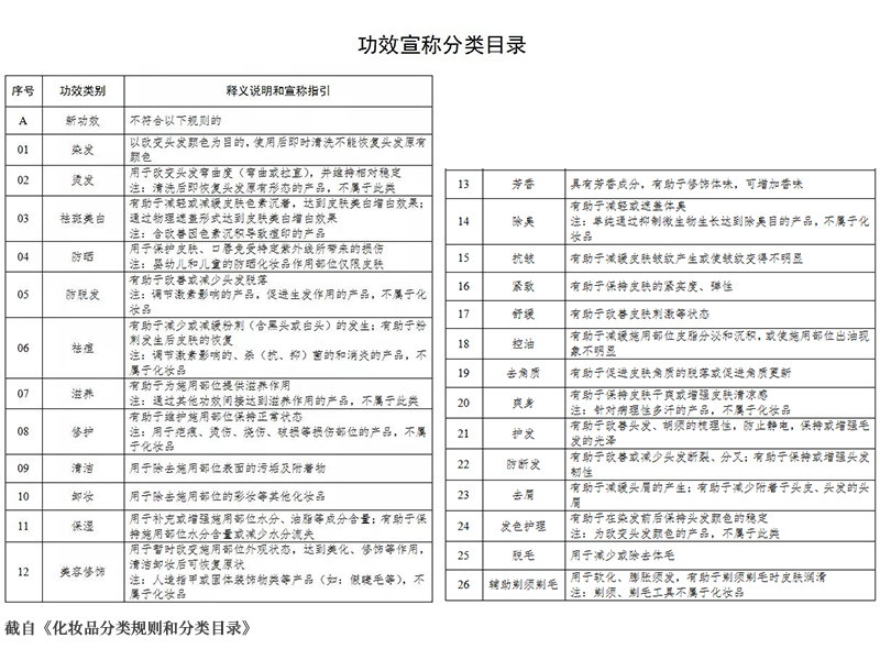 新规体系下,国家药监局给出了26个官方功效名称。《化妆品分类规则和分类目录》将化妆品功效分成了26个大类和新功效,包括染发、烫发、祛斑美白、脱毛、滋养、修护、紧致、抗皱、舒缓等,也被称为26+A。