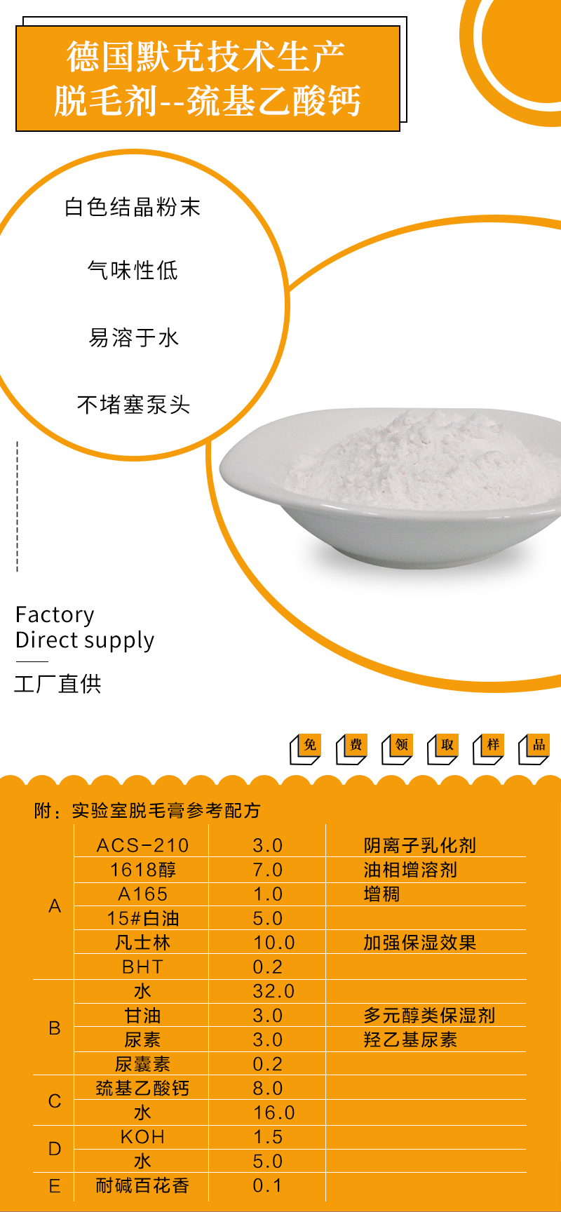 巯基乙酸钙作为一款我司自主生产的脱毛剂原料,采用的是德国默克的技术。质量保证,证件齐全。