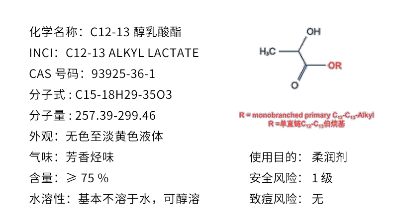 C12-13 醇乳酸酯是具有多种功能的极性润肤剂,它由特殊的脂肪醇酯化而成的乳酸酯,体现了乳酸衍生物